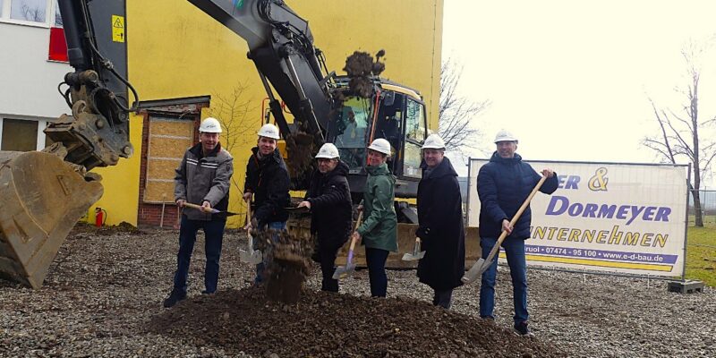 Von links nach rechts: Ulrich Latus (ehemaliger Ortsvorsteher), Tim Edbauer (von der Baufirma Edbauer), Rolf Bickelmann (Leiter des Fachbereichs Hochbau und Gebäudemanagement), Uhland-Rektorin Karin Huste, Ortsvorsteher Norbert Schnitzler und OB…