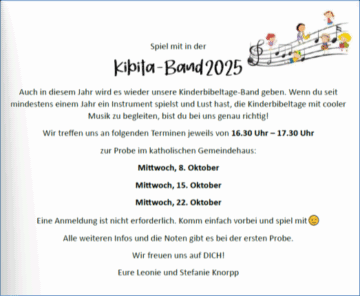 auch dieses Jahr soll es wieder Kinderbibeltage geben – wie immer am ersten Wochenende der Herbstferien, 24. bis 26. Oktober 2025. Das diesjährige Thema lautet: „Alles gut im Schneckenhaus“. Möglich sind die Kinderbibeltage aber – wie immer – nur dann, wenn möglichst viele von Euch (wieder) dabei sind und die Zeit in den Gruppen vorbereiten und leiten, Theater spielen, Musik machen, die Technik bedienen oder für’s leibliche Wohl sorgen. Ein Vortreffen für alle, die dieses Jahr mitmachen, soll am Donnerstag, 25. September 2025, um 19.30 Uhr im Gemeindehaus St. Urban stattfinden. Leitet diese Info über unser erstes Treffen gerne auch an andere Interessierte weiter und ladet sie ein, mitzumachen! Wer an 25.9.25 keine Zeit hat, kann trotzdem mitmachen. Gerne einfach vorher Bescheid geben und sagen, welche Aufgabe Ihr bei den Kinderbibeltagen übernehmen könntet/möchtet. Wir freuen uns auf Euch!